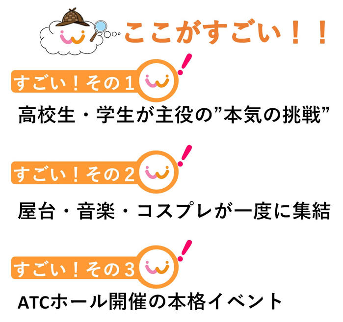- ATC文化祭は、若者たちの「挑戦」と「表現」が一堂に会する、新しいかたちの文化祭です。2026年6月、ATCホールを舞台に、次の3つの企画を同時開催します。