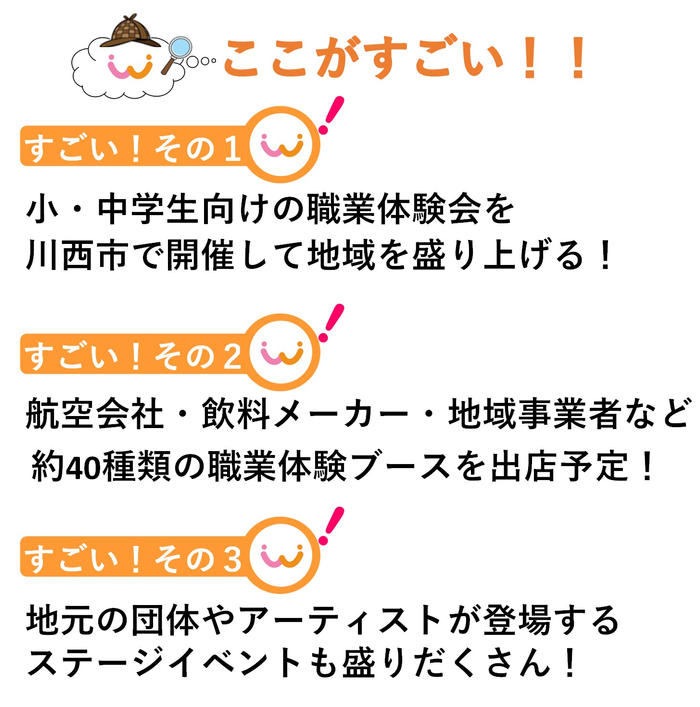 - 今回開催する、『ジョブランド川西』は小・中学生向けの職業体験会であり、自身が『夢』にしている職を体験することで、その職業に就くことを『目標』にしてもらいたいという思いで企画をしています。